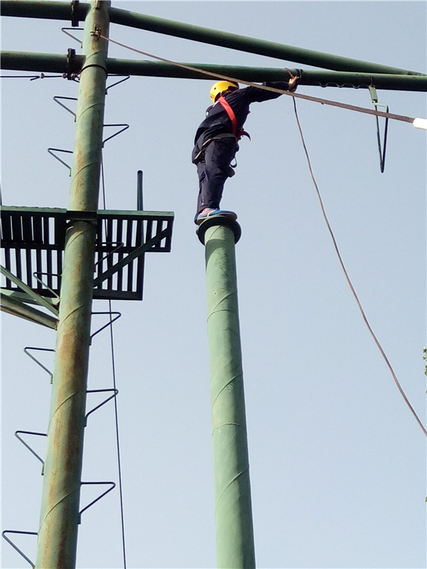 ? ? 這個項目是“高空抓杠”。要求隊員依次獨立的爬上立柱,在圓盤上站穩后,雙腿同時用力蹬出,雙臂前伸抓住掛在前方的單杠。